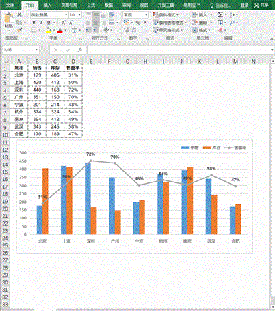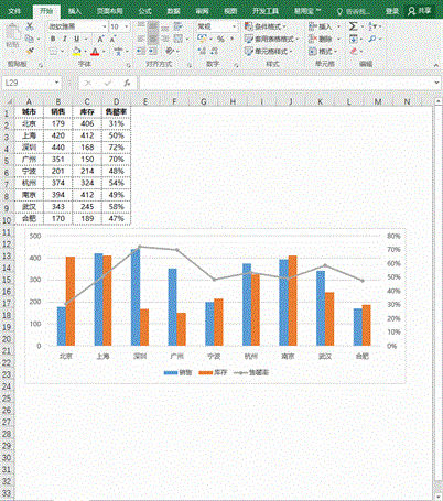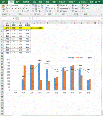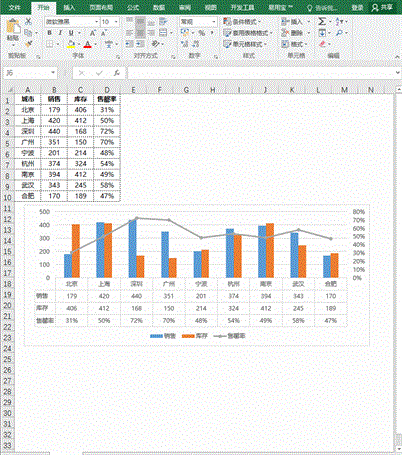 例如,在图表中添加售罄率系列标签,然后让库存和销售显示在数据表位置。