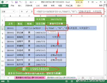 如下图,我们在对应的表格中输入=TEXT(10-DATEDIF(D3-10,TODAY(),”YD”),”还有0天生日;;今天生日”),就可以得到我们想要的结果,这里只有10日以内的生日才会提醒,其他则显示空白。以前学过TEXT函数的用法,这里把DATEDIF函数的计算结果作为TEXT函数的参数。