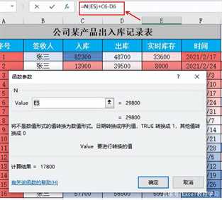 这里N函数的参数单元格是E5,然后加上入库列的C6,减去出库列的D6,所以当计算2月17日的库存时,公式则为:=N(E2)+C3-D3。