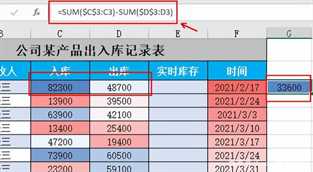 这个公式的含义正如上面所言,是入库的总和减去出库的总和,亮点在于sum函数的求和区域。