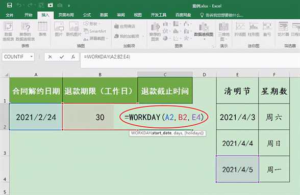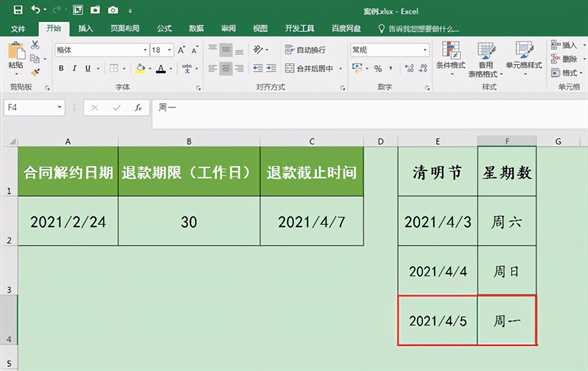 3.网络搜索2021年度放假安排,可知2021/2/24到2021/4/7之间除了常规的周末假期(周六周日)外,还有一个清明节(2021/4/3-2021/4/5)。我们在工作表的E列到F列中将清明节三天假期的日期和对应的星期数一同列出,E4单元格中的日期2021/4/5(星期数为周一)即为Workday函数的第三个参数Holidays。