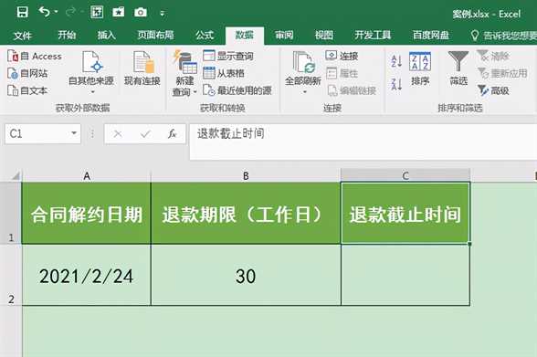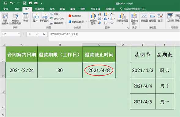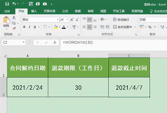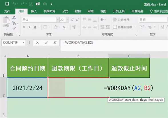 实例:小宝跟A单位提前解约了一份合同,按照约定A单位要支付小宝一笔退款,退款在合同解约后30个工作日内退还到小宝的个人账户。合同解约日期是2021年2月24日,那A单位的退款截止日期是哪一天呢?如何快速进行计算?这篇文章我们一起来学习一下。
