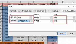 点击自定义排序,设置主关键字和次关键字。如下图所示的升序,那么品类列会根据拼音的先后顺序排列,再进行订单数量从小到大的排列。