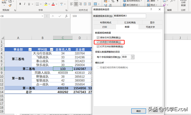 最佳答案显示数据透视表所有源信息的方法:操作步骤:点击透视表任意单元格→数据透视表选项→数据→勾选“启用显示明细数据”(默认已勾选)→选择对应数值位置→双击鼠标左键即可进入源汇总数据数据透视表获取数据源信息备注:双击对应数值项,进入明细是对应某个项目的明细数据,用于特定的数据查询,例如点击飞跃战队的报名人数......