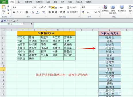 解决方法:在Q2单元格中输入公式:=OFFSET($J$2,(ROW(A1)-1)/5,MOD(ROW(A1)-1,5))&””,向下填充复制公式,即可。