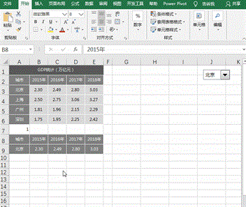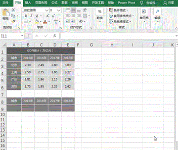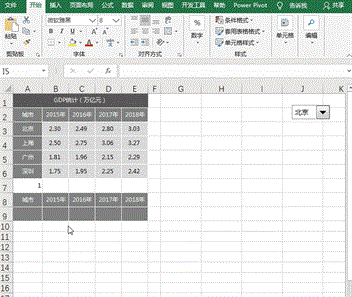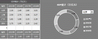 原始数据2015年-2018年北上广深四大城市的GDP数据,其中数据位于B3:E6单元格中。