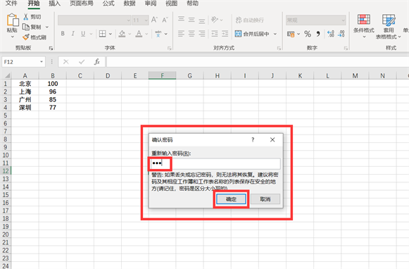 6、单击【确定】之后,重新弹出了一个【确认密码】对话框,将我们刚刚设置的密码重新输入一遍,再次单击【确定】,如下图所示。