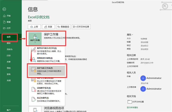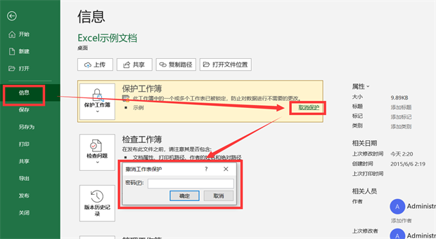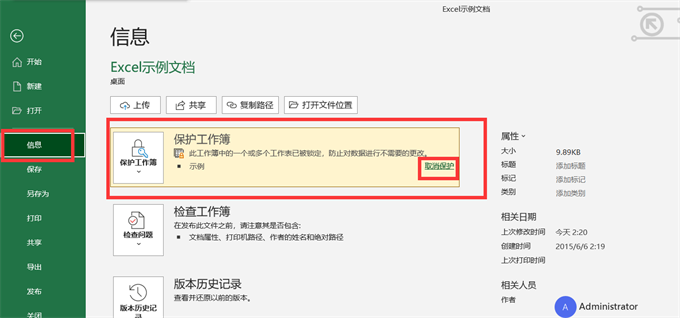 9、如果想要取消对该工作表的保护,单击【文件】,单击【信息】,找到【保护工作簿】图例右下角的【取消保护】,如下图所示。