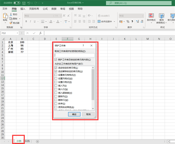 4、单击【保护当前工作表】之后,会弹出【保护工作表】对话框,页面下方的横轴上显示有【示例】和【实践】两个工作表,我们现在要保护的的就是选中的这个【示例】工作表,如下图所示。