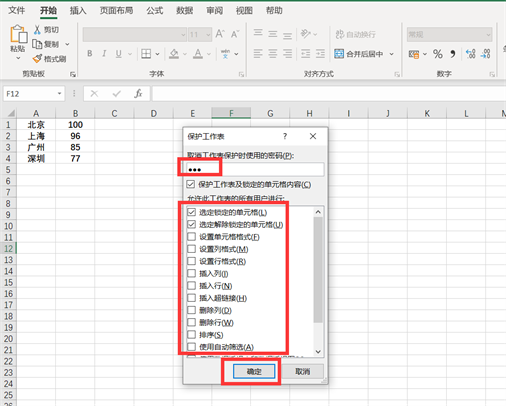 5、在【保护工作表】对话框的【取消工作表保护时使用的密码】下方的输入栏中输入我们要设置的密码,同时还可以选定被保护的工作表允许进行的操作,设置完毕之后,单击【确定】,如下图所示。