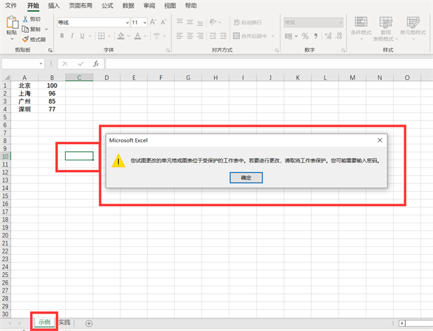 7、设置保护工作表,如果我们试图想要改动这个工作表会是什么效果呢?如下图所示,当我们现在想要在【示例】工作表的某个单元格输入内容时就会弹出如下提示,告诉我们需要输入密码,否则操作无法完成。