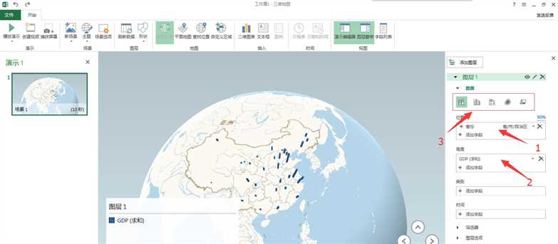最佳答案工具:office 2016 excel数据:2014年中国31生GDP图表生成步骤:1.首先打开‘2014年中国31生GDP.xlsx’文件,选中数据,如图所示2.选择“插入”-“三维地图”-“打开地图”,然后再选择将选定数据添加到三维地图3.然后在打开的窗口可以看到如下所示,在1处选择省份,2处......