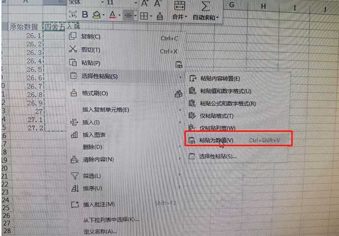 2. 而这时四舍五入后的数字就是一个公式,需要再进行一步复制,选择复制后不要直接粘贴,二是点击鼠标右键,选择“选择性粘贴”,这样粘贴出来的数值就不是公式了。