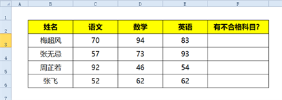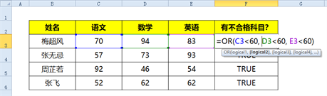 根据实际需求,以梅超风为例,即在C3, D3, E3中,只要有一个小于60,则含有不合格科目。用常规文字描述是:C3<60或D3<60或E3<60,刚好符合OR函数的运算规则,所以,可以用公式:OR(C3<60, D3<60, E3<60)来表示。最终结果如下: