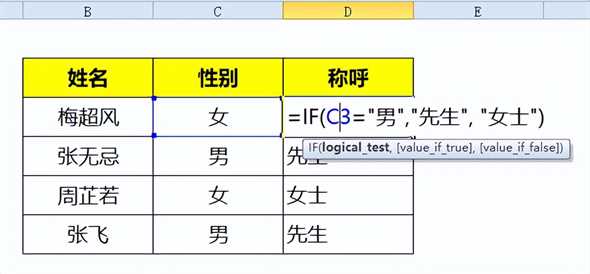按IF函数的格式,我们先求得梅超风的称呼,而该称呼是根据C3单元格的值来决定的。所以条件是:C3=”男”。成立时:”先生”。不成立时:”女士”,最终得出的公式为: