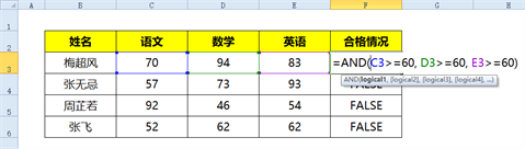 以梅超风同学为例,她的成绩分别对应C3, D3, E3,要想知道这三科是否都及格,用常规的文字描述是:C3>=60且D3>=60且E3>=60,刚好符合AND函数的运算规则,所以,可以用公式:AND(C3>=60, D3>=60, E3>=60)来表示。最终结果如下:
