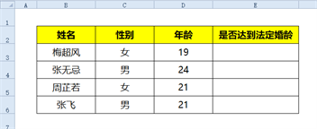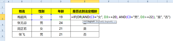 =IF(OR(AND(C3=”女”, D3>=20), AND(C3=”男”, D3>=22)), “是”, “否”)