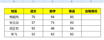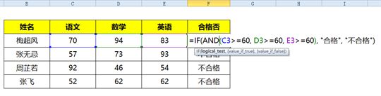 =if(and(C3>=60, D3>=60, E3>=60), “合格”, “不合格”),结果如下图所示: