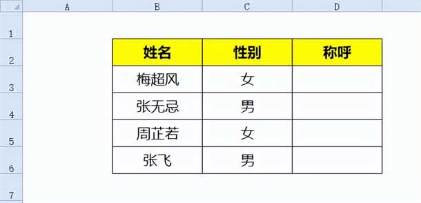 =IF(C3=”男”, “先生”, “女士”) 或者 =IF(C3=”女”, “女士”, “先生”),如下图所示: