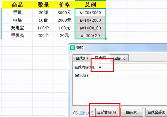 最佳答案操作方法:在D2单元格中先输入任意一个字母,比如以“A”为例。输入“A=20*3000”,回车;【Ctrl+E】填充然后选中区域,【Ctrl+H】,在替换对话框中的,{查找内容}输入【A】,然后选择【全部替换】然后总额就出来啦!......