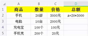 在D2单元格中先输入任意一个字母,比如以“A”为例。输入“A=20*3000”,回车;