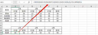 这里可以输入公式=INDEX($A$3:$G$6,MATCH($A$11,$A$3:$A$6,0),COLUMN(B1))