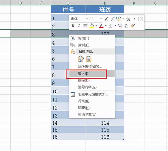 操作一:插入行。选中任一行,右击进行【插入】行操作,如下图在序号3前插入一行: