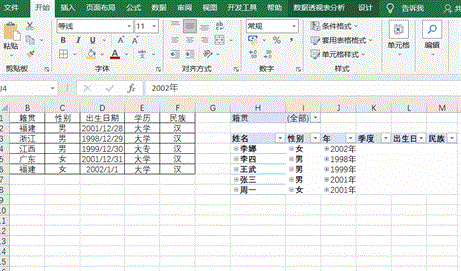 最佳答案选中区域,点击插入——表格——数据透视表——表格和区域,这时会弹出一个界面,将位置设置为“现有工作表”,选择号区域,点击确定。将“籍贯”字段拉到筛选字段中,随后根据需要将其他字段放在对应列表即可。这时你会发现这里的出生日期无法显示到表格中,该怎么处理?选中日期,右击选择【取消组合】即可显示具体日期。......