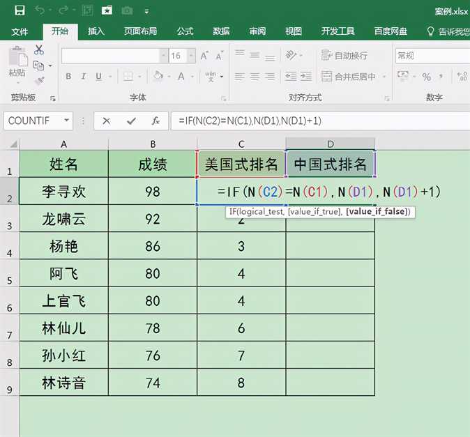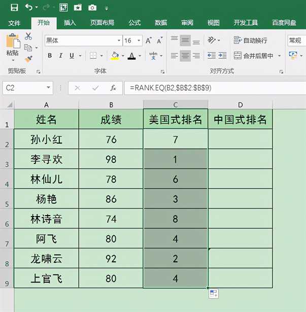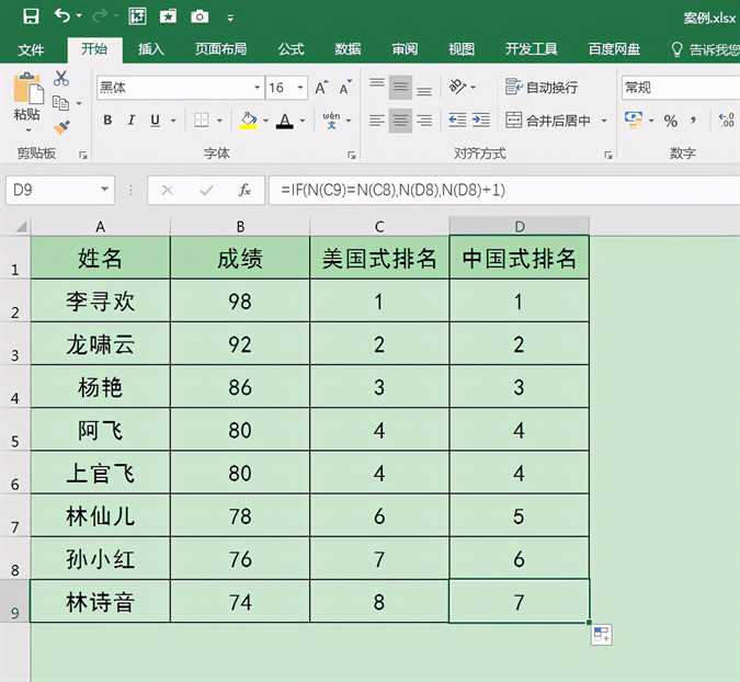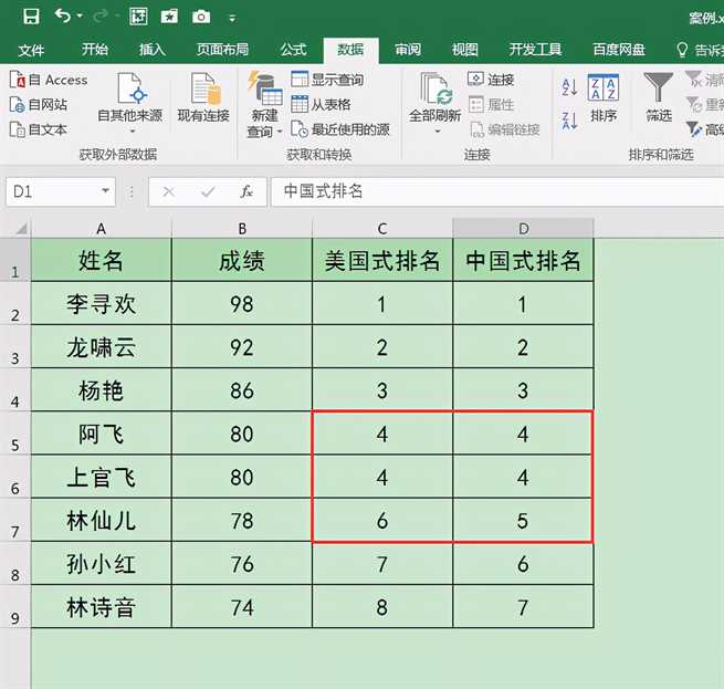 效果如下图所示,两种排名方式的区别在于:如果排名名次有重复,美国式排名中会有名次被跳过,比如下图C列中有两个第“4”名,第“5”名被跳过,下一个名次直接到了第“6”名。如果是中国式排名,即使有重复名次,也不会有名次被跳过,第“5”名会接在两个重复的第“4”名后面(参见下图D列)。