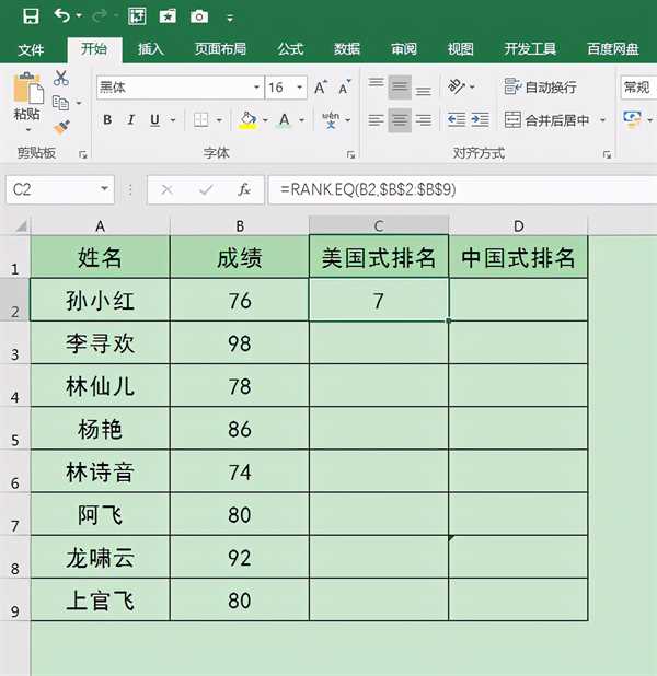 1.打开要进行排名的原始工作表,选中C2单元格,在英文输入法状态下输入公式:=RANK.EQ(B2,$B$2:$B$9),按回车键确认公式,可以得到第一个人员“孙小红”的排名“7”。