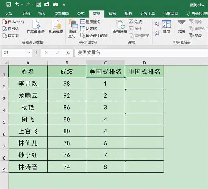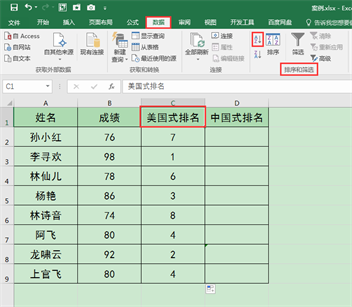 1.选中C1单元格“美国式排名”,在“数据”选项卡“排序和筛选”功能组中单击“升序”按钮,这样所有人员的名次会从1到8进行升序排列。