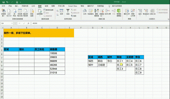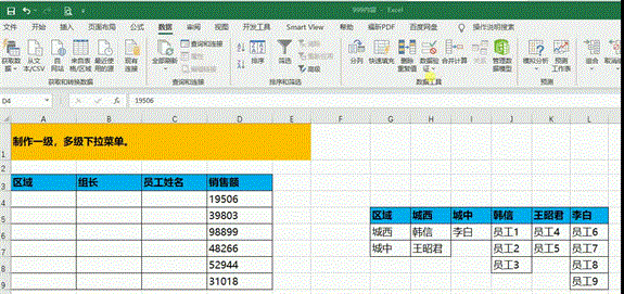 举例:选择了“城中”,选择组长时只能选择“李白”,选择了组长李白只能选择“员工6-9”