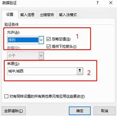 1、来源。可以手动输入(举例:城中,城西,一定要注意,2个文本之间是英文逗号);或者选择某个区域。演示如下