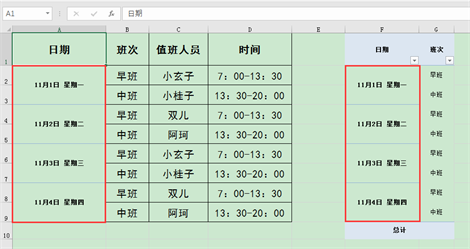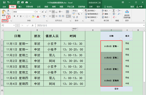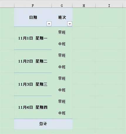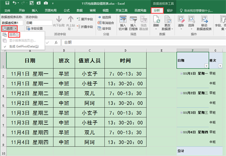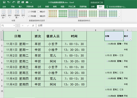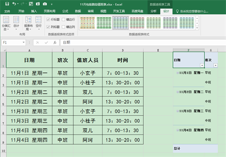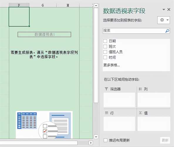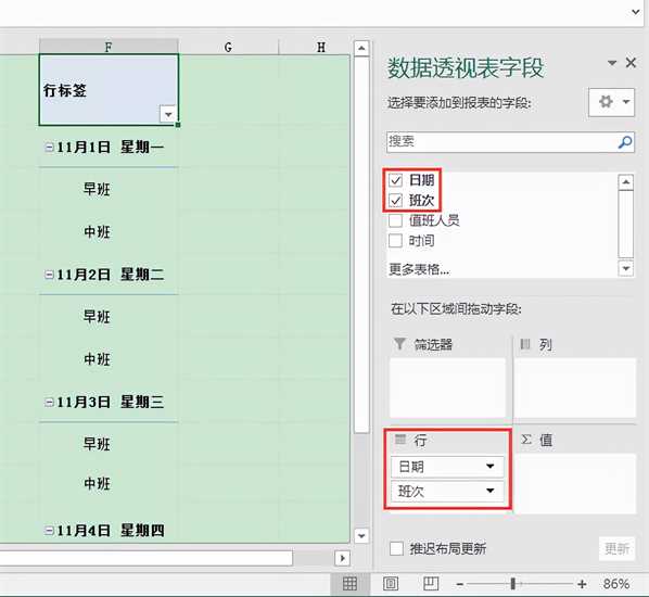 3.在窗口右侧打开的“数据透视表字段”窗格中,勾选字段列表中的“日期”“班次”,这样这两个字段就会出现在下方的“行”区域中,同时在工作表的F列会出现对应的数据透视表。