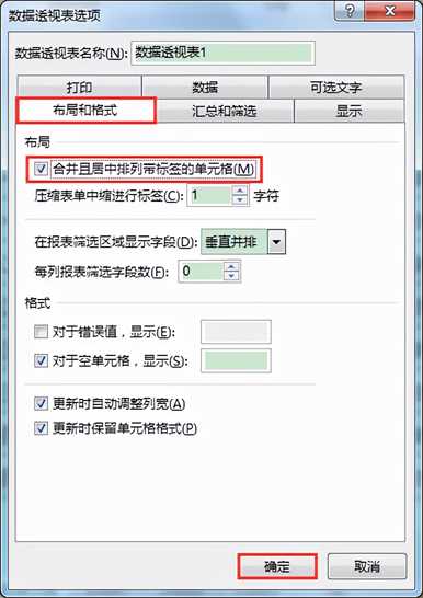 7.在打开的“数据透视表选项”对话框中,切换到“布局和格式”选项卡,在“布局”下面勾选“合并且居中排列带标签的单元格”,单击“确定”按钮。此时,F列中相同日期的单元格将全部进行合并。