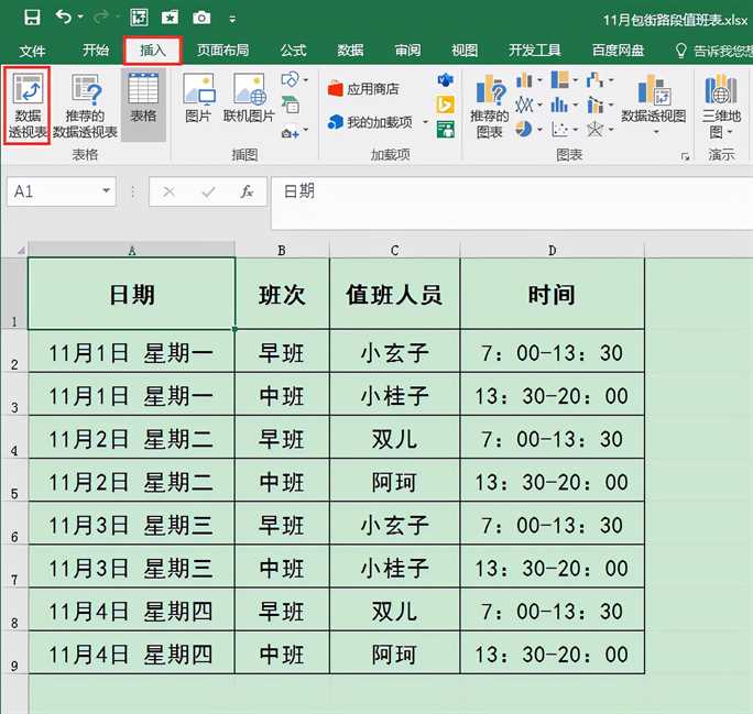 1.选中工作表数据区域任一单元格,如A1单元格,在“插入”选项卡“表格”功能组中单击“数据透视表”按钮。