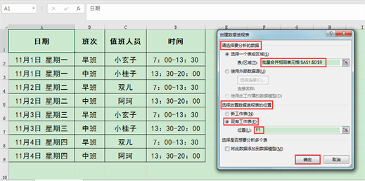 2.在打开的“创建数据透视表”对话框中,选择要分析的数据区域为当前工作表的$A$1:$D$9单元格区域,选择放置数据透视表的位置为“现有工作表”的“F1”单元格,单击“确定”按钮。
