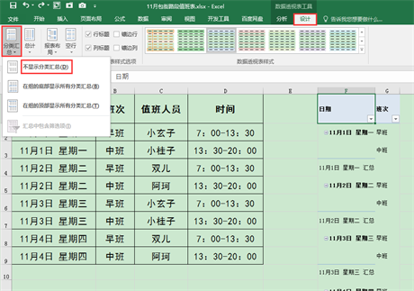 5.在“数据透视表工具”“设计”选项卡下的“布局”功能组中单击“分类汇总”按钮,在下拉列表中选择“不显示分类汇总”。
