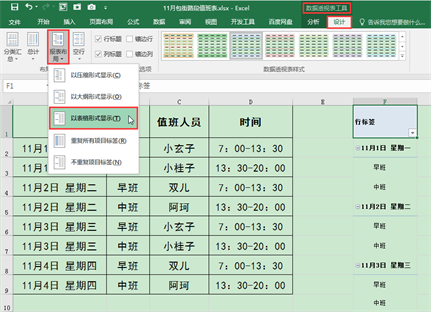 4.在“数据透视表工具”“设计”选项卡下的“布局”功能组中单击“报表布局”按钮,在下拉列表选择“以表格形式显示”。
