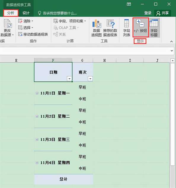 8.在“数据透视表工具”“分析”选项卡下的“显示”功能组中单击“+/-按钮”,可将F列中日期前面的按钮全部隐藏。