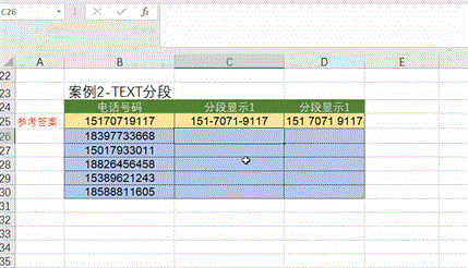 1.在目标单元格中输入公式:=TEXT(B26,”000-0000-0000″)