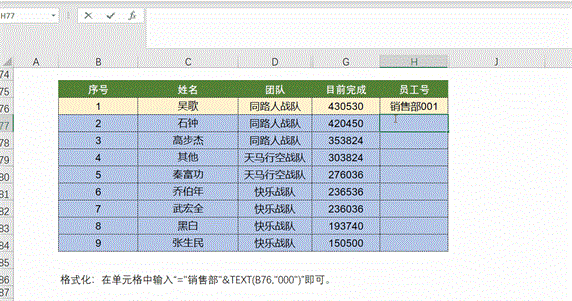 在单元格中输入“=”销售部”&TEXT(B76,”000″)”即可。
