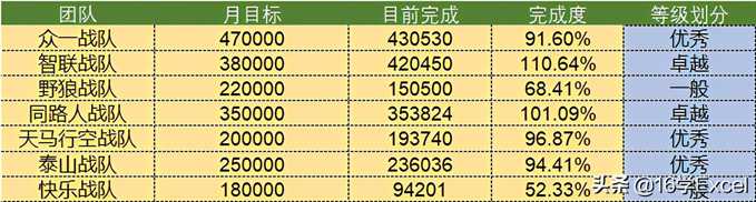 目的:分等级:完成度大于100%>卓越,>80%,优秀,小于或者等于80%,一般