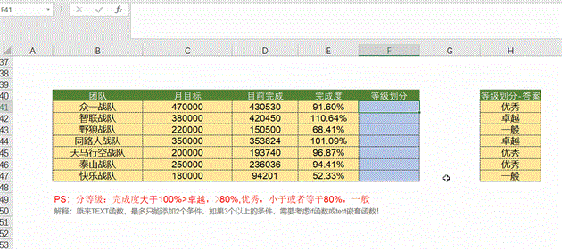 公式:TEXT(E41,”[>1]卓越;[>0.8]优秀;一般”)