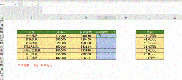 在单元格D2中输入“=TEXT(D41,”0!.0,万元”)”即可。