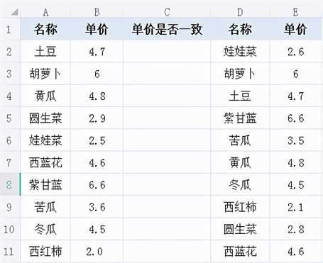 2、如果单价相等,那么单元格为空;如果不相等,则为不一致。