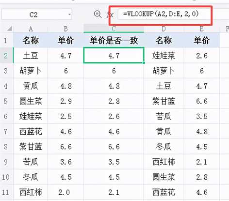最佳答案操作方法:1、首先我们先将蔬菜对应的E列的单价填写到C列。公式【=VLOOKUP(A2,D:E,2,0)】2、如果单价相等,那么单元格为空;如果不相等,则为不一致。那么这时候我们在嵌套IF函数来进行判断。公式【=IF(VLOOKUP(A2,D:E,2,0)=B2,””,......