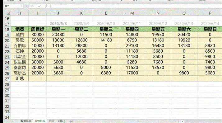 最佳答案业绩随日期变化操作步骤:1.设计表头,星期和业绩随日期变化设计表头2.表格内填充公式=SUMIFS(数据原表!$D:$D,数据原表!$B:$B,业绩跟踪!$H19,数据原表!$A:$A,业绩跟踪!J$17)备注:要注意相对引用以及绝对引用表格内填充公式3.快速汇总:Alt+=......