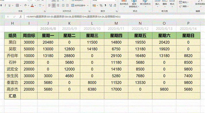 =SUMIFS(数据原表!$D:$D,数据原表!$B:$B,业绩跟踪!$H19,数据原表!$A:$A,业绩跟踪!J$17)