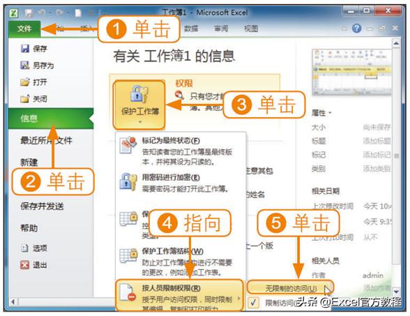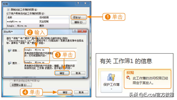 最佳答案(1)添加管理用户步骤01 ①单击“开始”选项卡,返回到工作簿中;②在编辑区的位置上会显示“限制访问”的提示,单击“更改权限”按钮,如下图所示。步骤02 ①在“权限”对话框中单击“添加”按钮;②在弹出的“添加用户”对话框中输入“读取”和“更改”的用户;③单击“确定”按钮;④添加完指定账户后单击“确定......